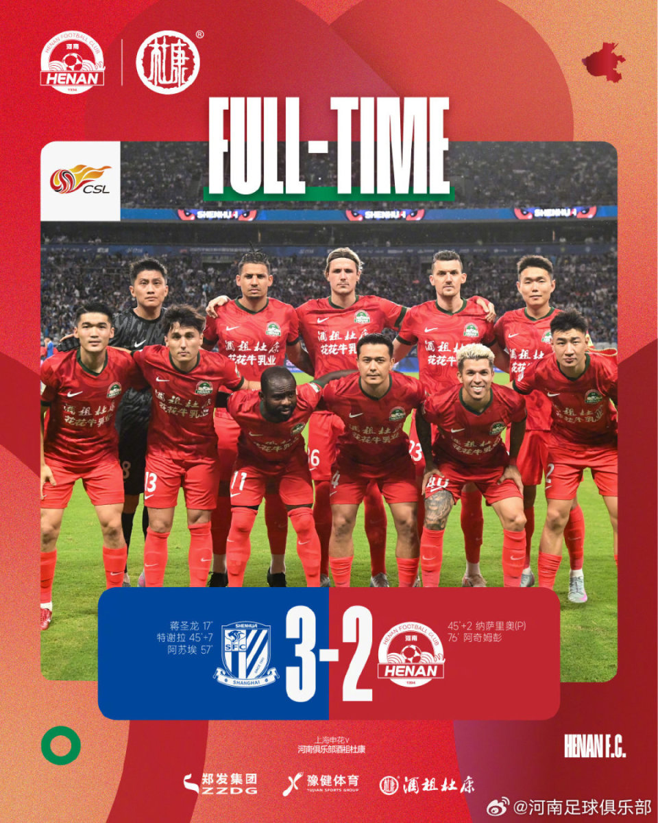最终,河南队在客场2比3不敌上海申花,联赛五轮未能取胜。而申花队凭借胜利已经拿到44分,拉开联赛第二名上海海港6分的差距,争冠形式一片大好。